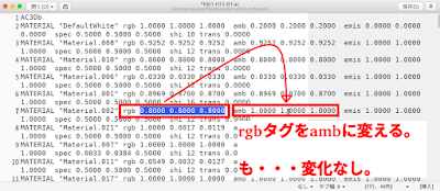 以前にも経験済みの事ですが何と対策すれども反映されず、チョット慌てるも暫し色々試すもNG。改めて「.ac」ファイルを古い機体のおと見比べて発見、・・・マテリアル欄の[emis]タグが違うので合わしてみると簡単にOKかな。(10000を00000に)